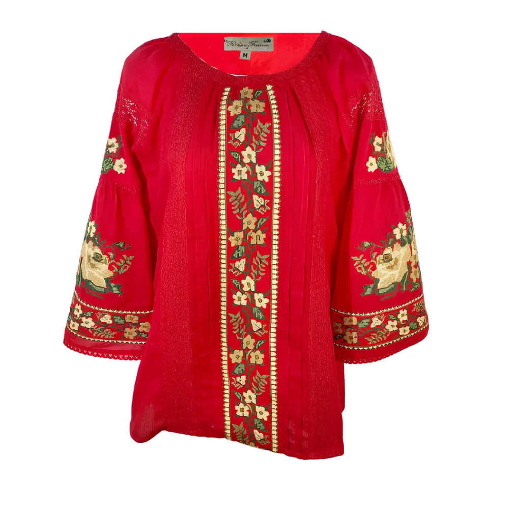 Bluza Traditionala Alba cu Motiv Geometric Rosu - BMG165