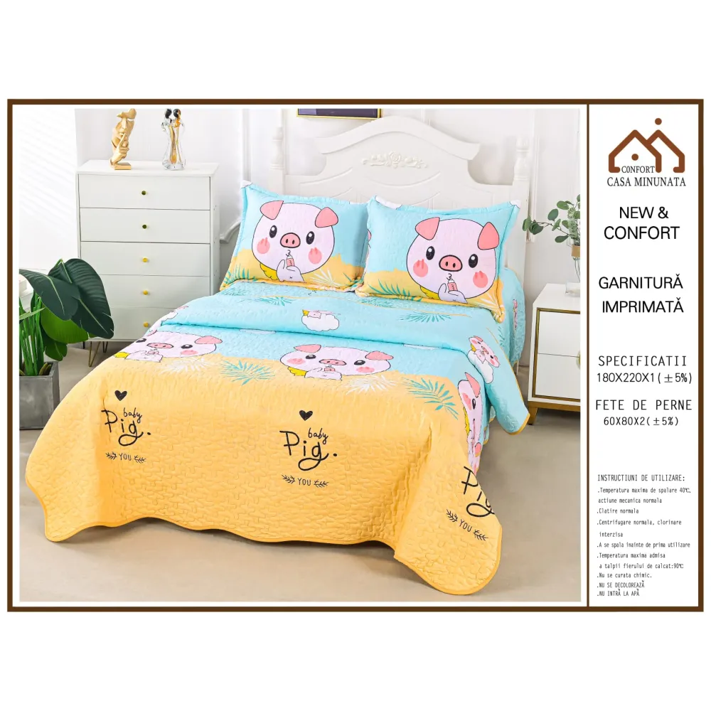 Set Cuvertura de Pat din Bumbac, 3 Piese cu Model - PIT250