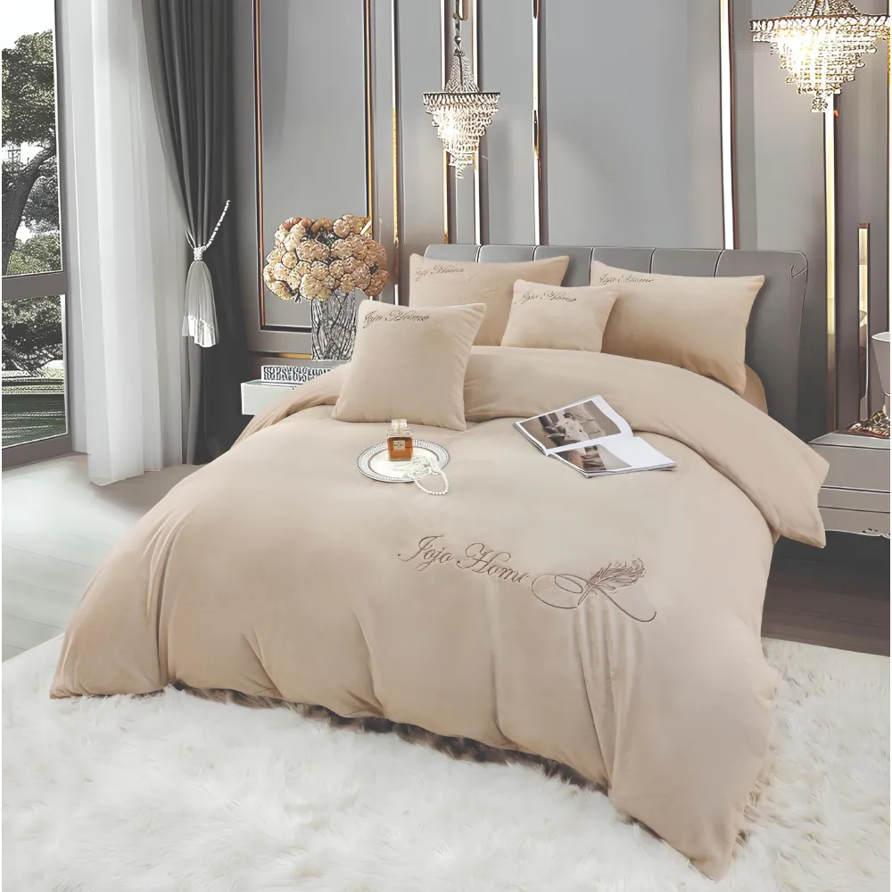 Lenjerie de Pat, din Catifea cu Broderie pentru Pat Dublu, 4 Piese, Bej - JO921