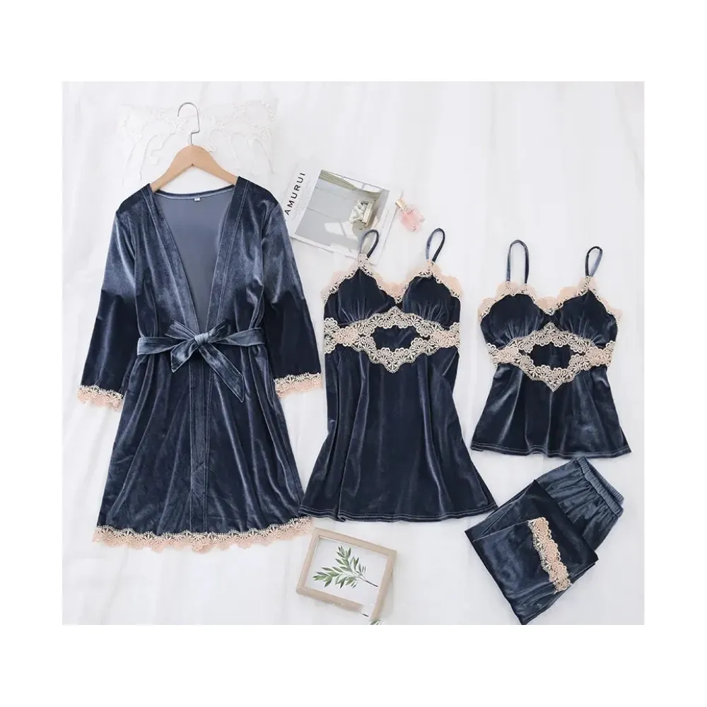 Set Pijama De Dama 4 Piese Gri Petrol Din Catifea- MEI14