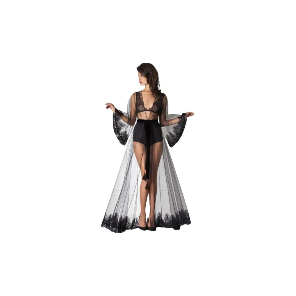 Halat de Dama din Voal si Broderie, Semi-Transparent, cu Cordon in Talie, Negru - MEI155