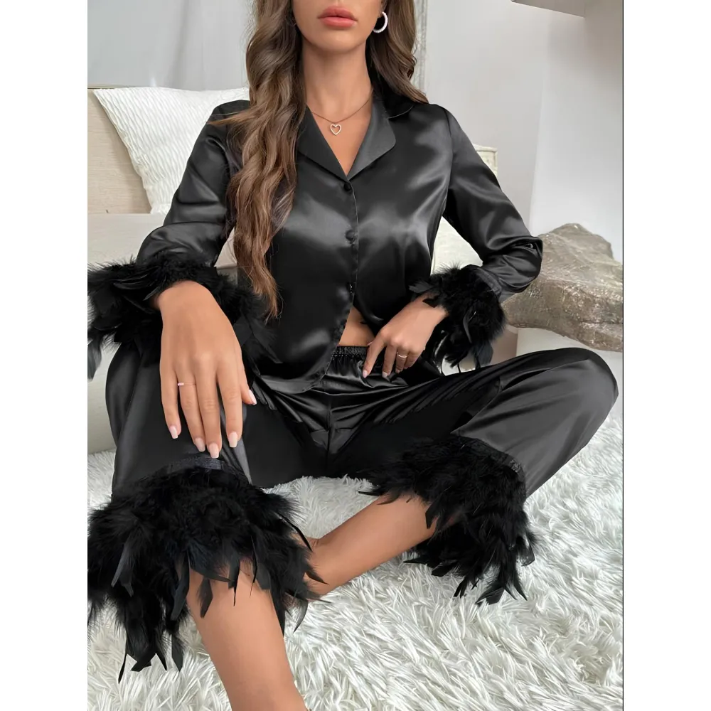 Set Pijama de Dama 2 Piese din Satin cu Puf, Culoare Negru - ANI133