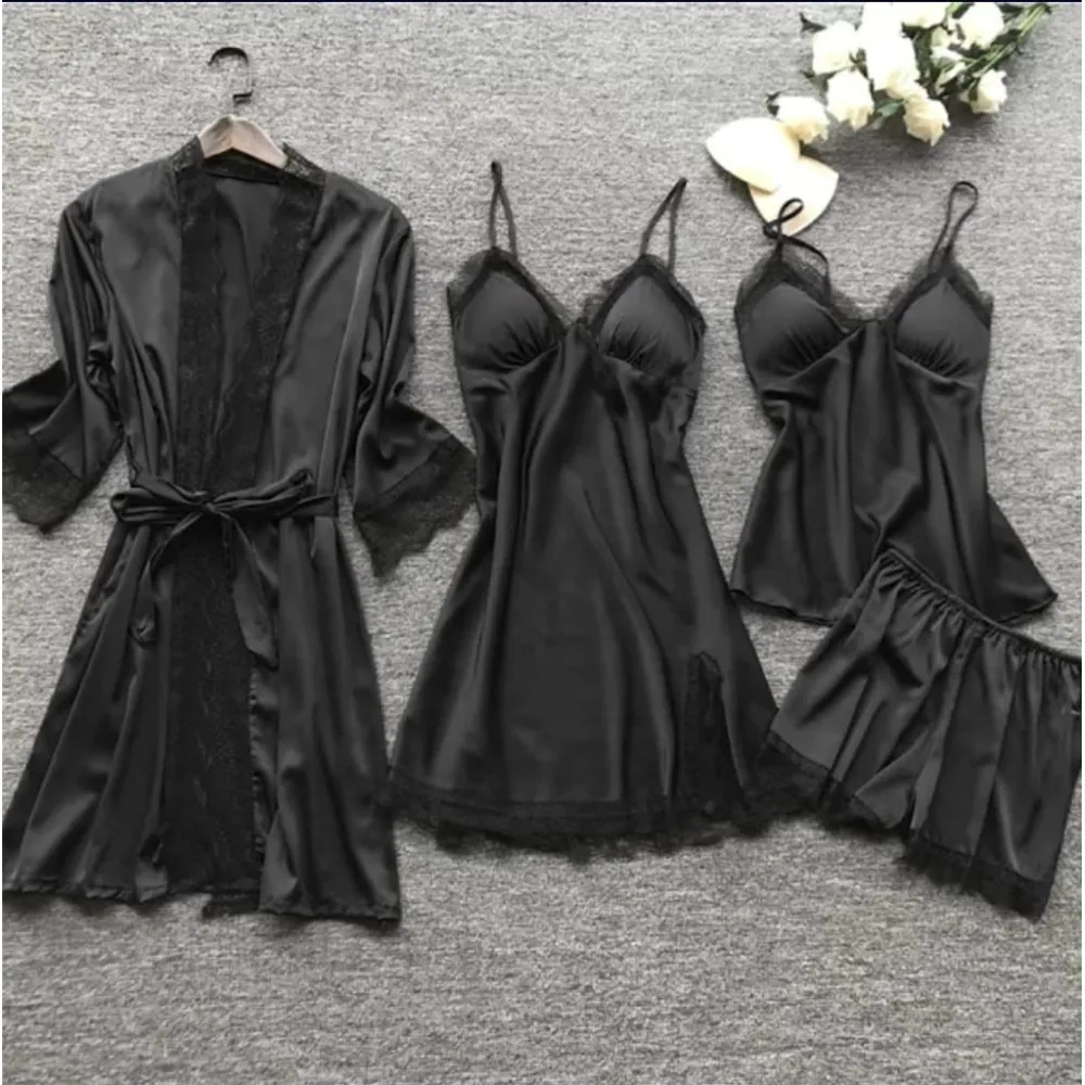 Set Pijama de Dama 4 Piese din Satin Negru
