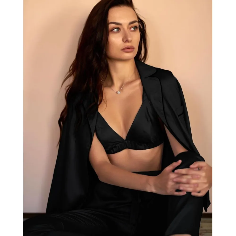 Set Pijama de Dama 3 Piese din Satin Negru