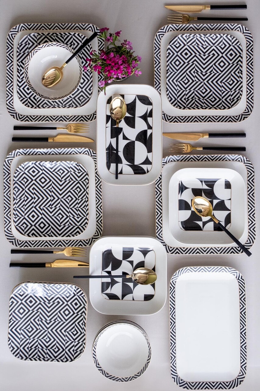 Set de cină (26 bucăți), Lessentiel Maison, 719KTP9893, Farfurie: 20 x 20 cm (6 bucăți), Alb / Negru / Auriu