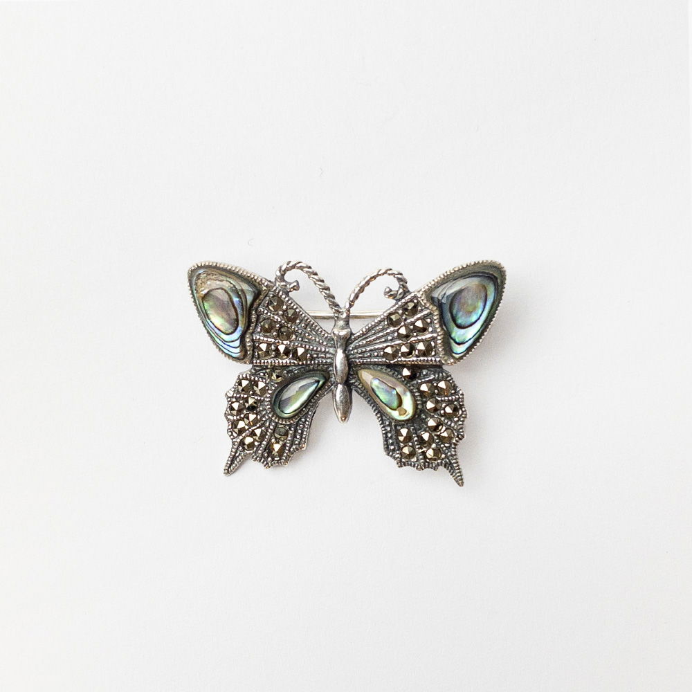Brosa fluture din argint 925 cu pietre foarte fine de marcasite si scoica paua shell