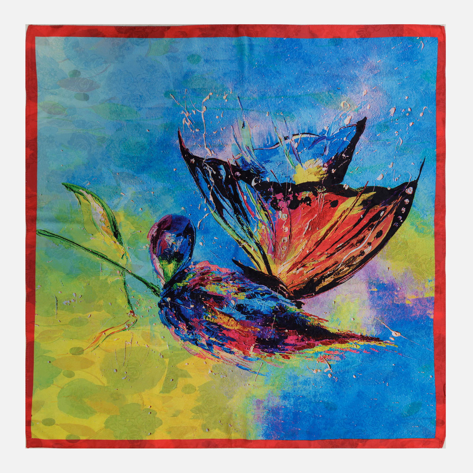 Esarfa premium din matase cu dubla fata, imprimeu fluture suprarealist multicolor