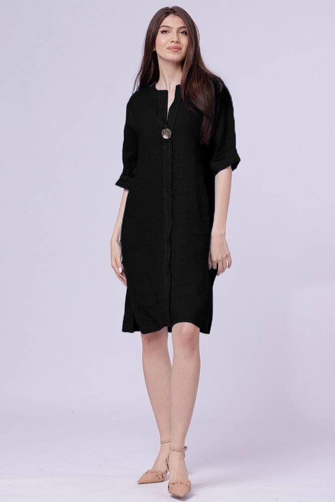 Rochie tunica din in neagra, cu nasture metalic decorativ Talie unica