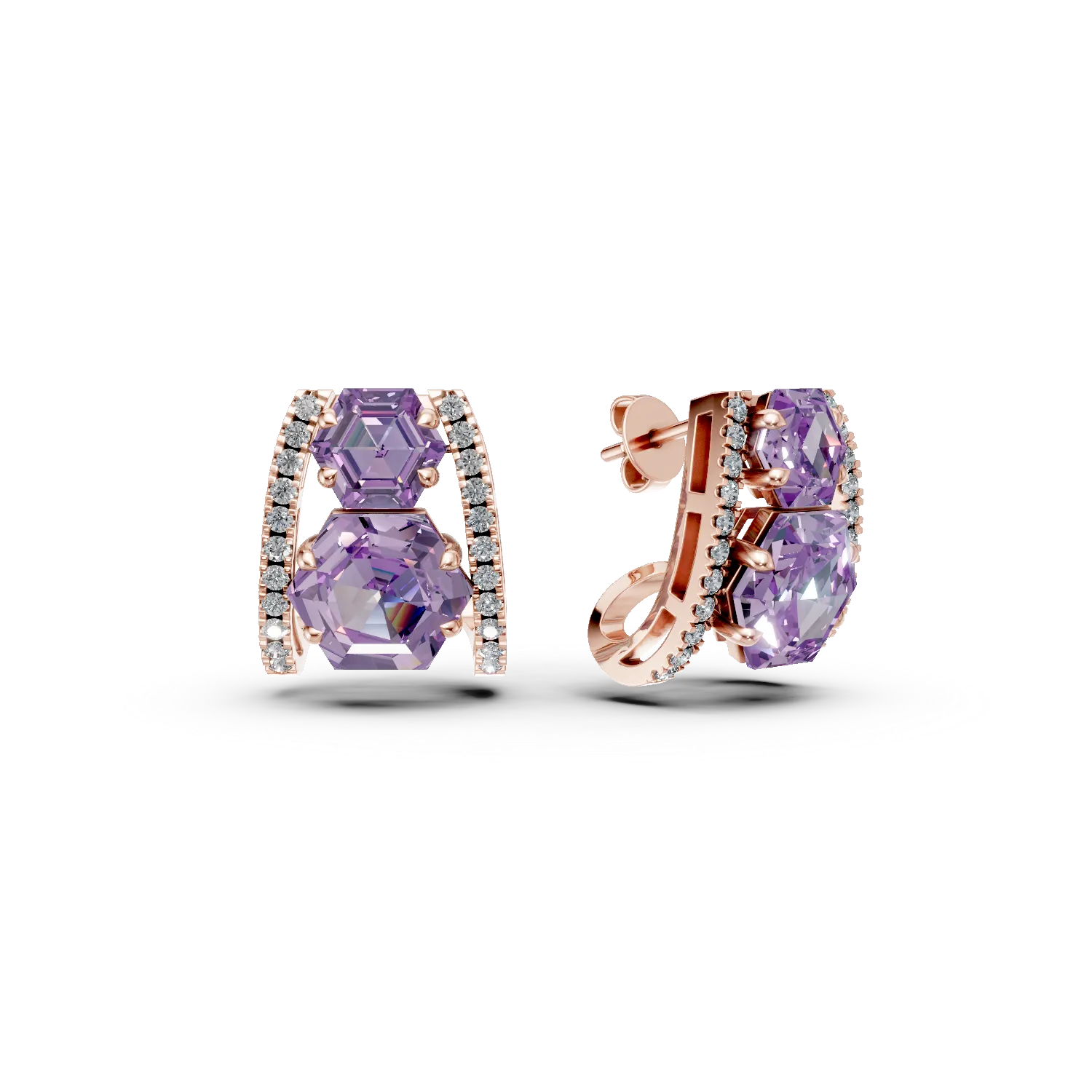Cercei geometrici din aur roz cu ametiste hexagonale de 3.06ct si diamante de 0.2ct