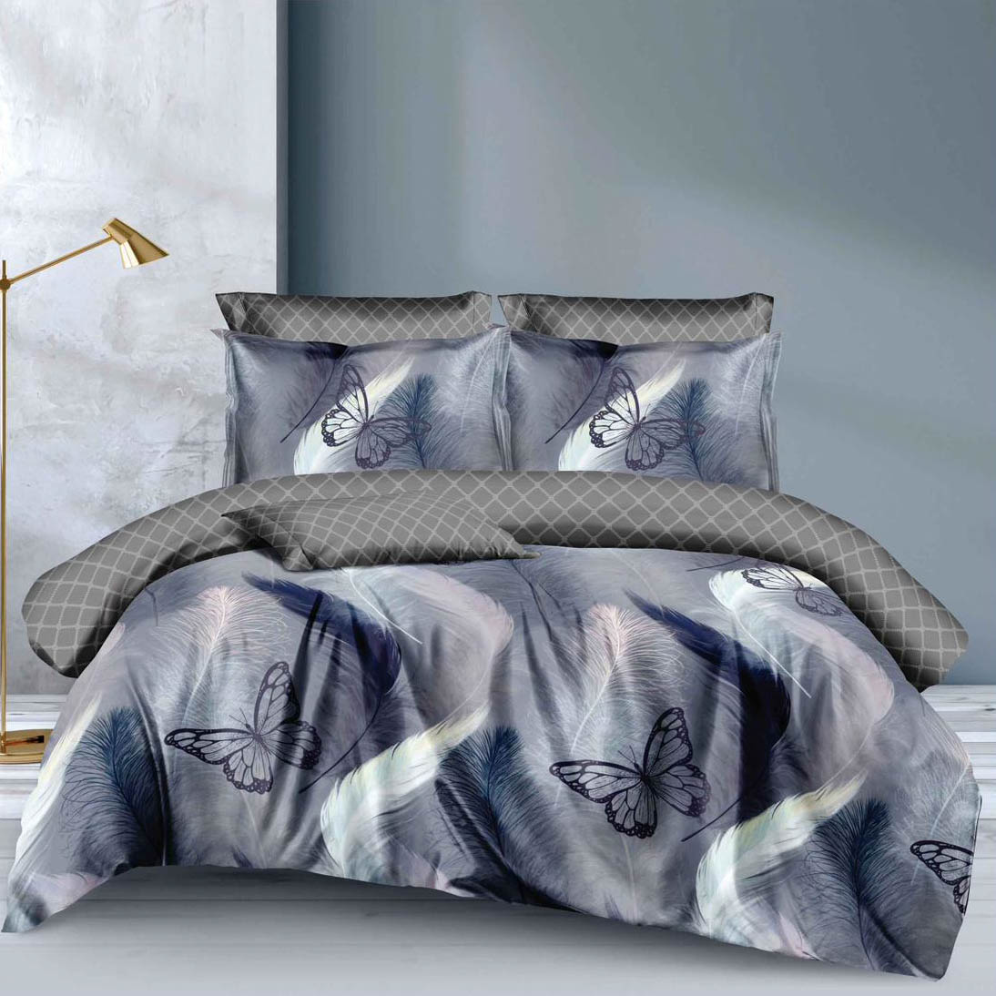 Lenjerie pat dublu, Finet, 6 piese, Gri, Albastru, fluturi