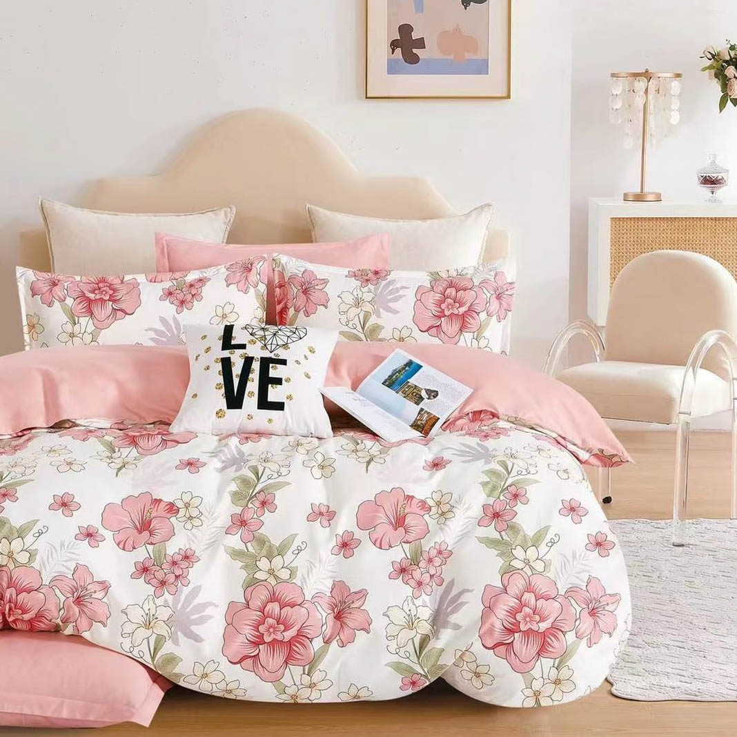 Lenjerie pat dublu, Finet, 6 piese, Roz, flori