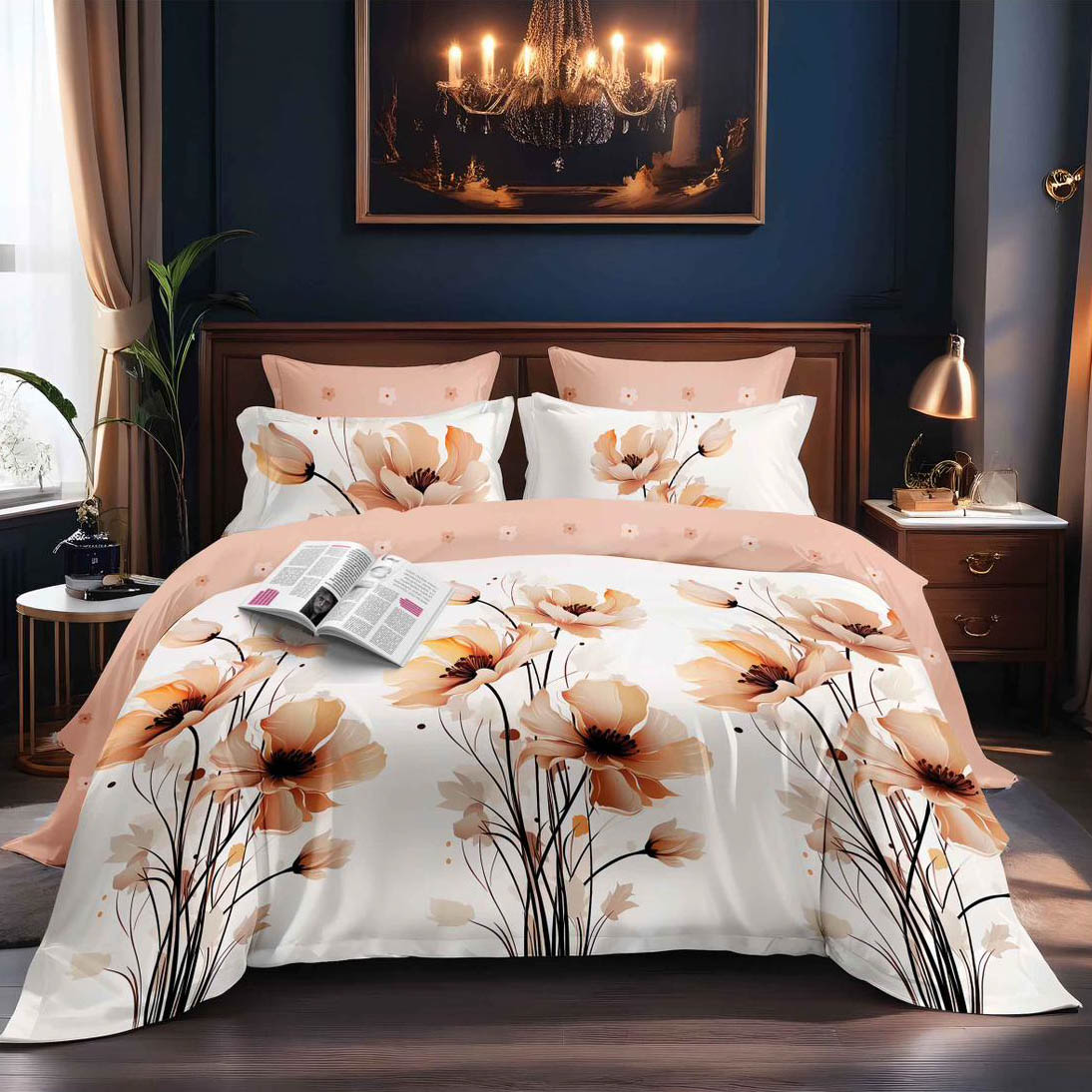 Lenjerie pat dublu, Finet, 6 piese, Somon, flori