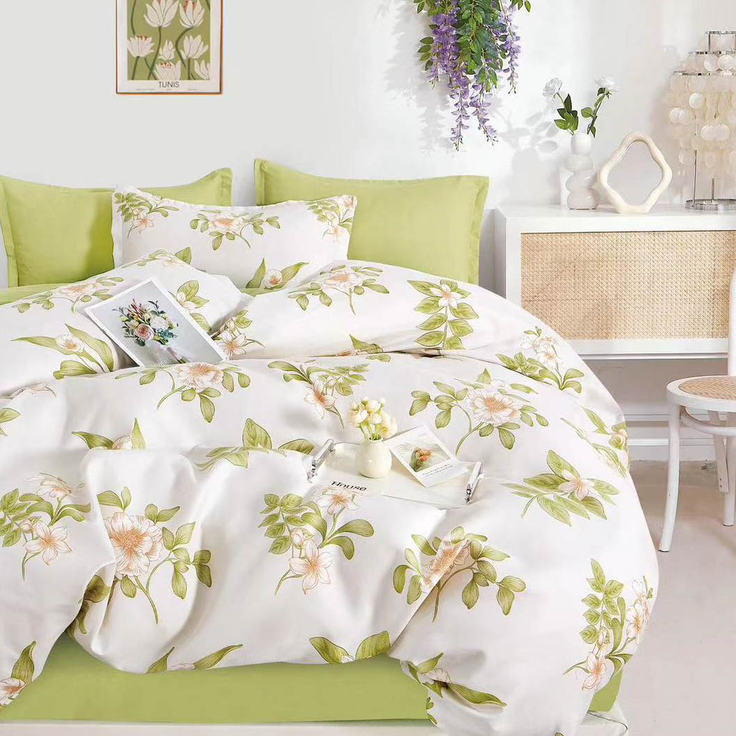 Lenjerie pat dublu, Finet, 6 piese, Crem, Verde, flori