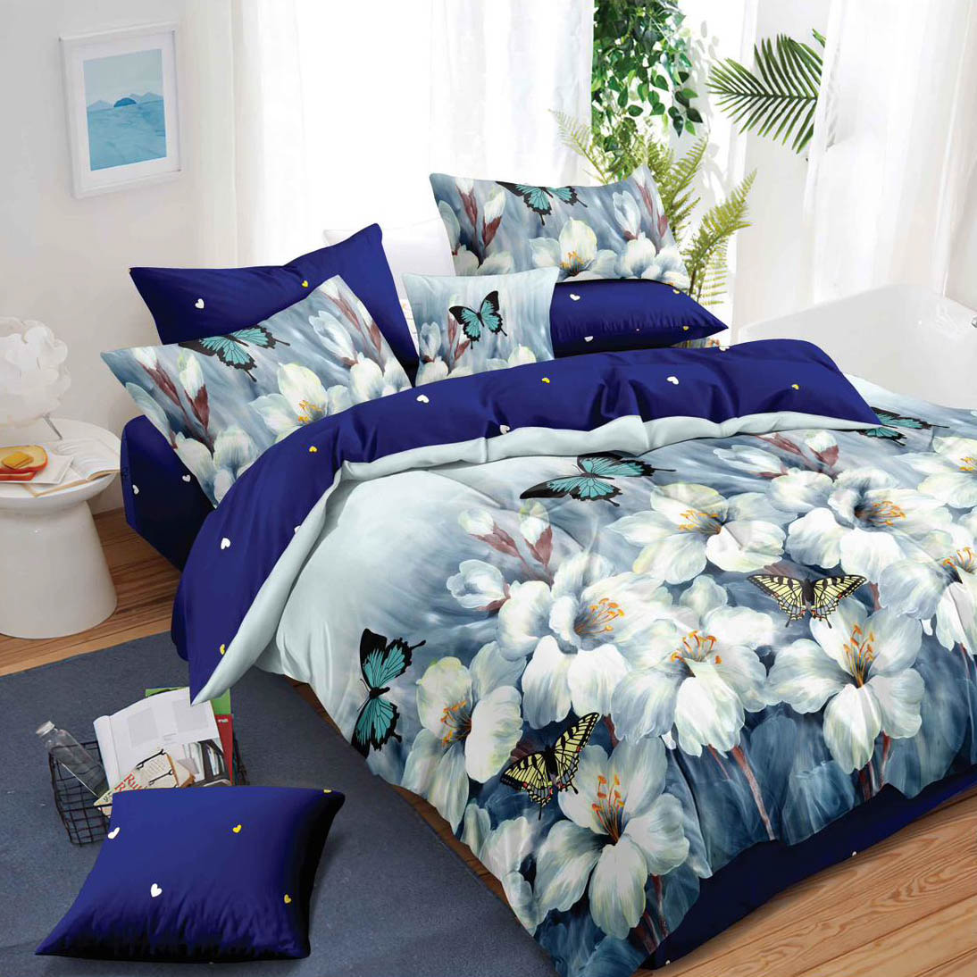 Lenjerie pat dublu, Finet, 6 piese, Alb, Albastru, flori