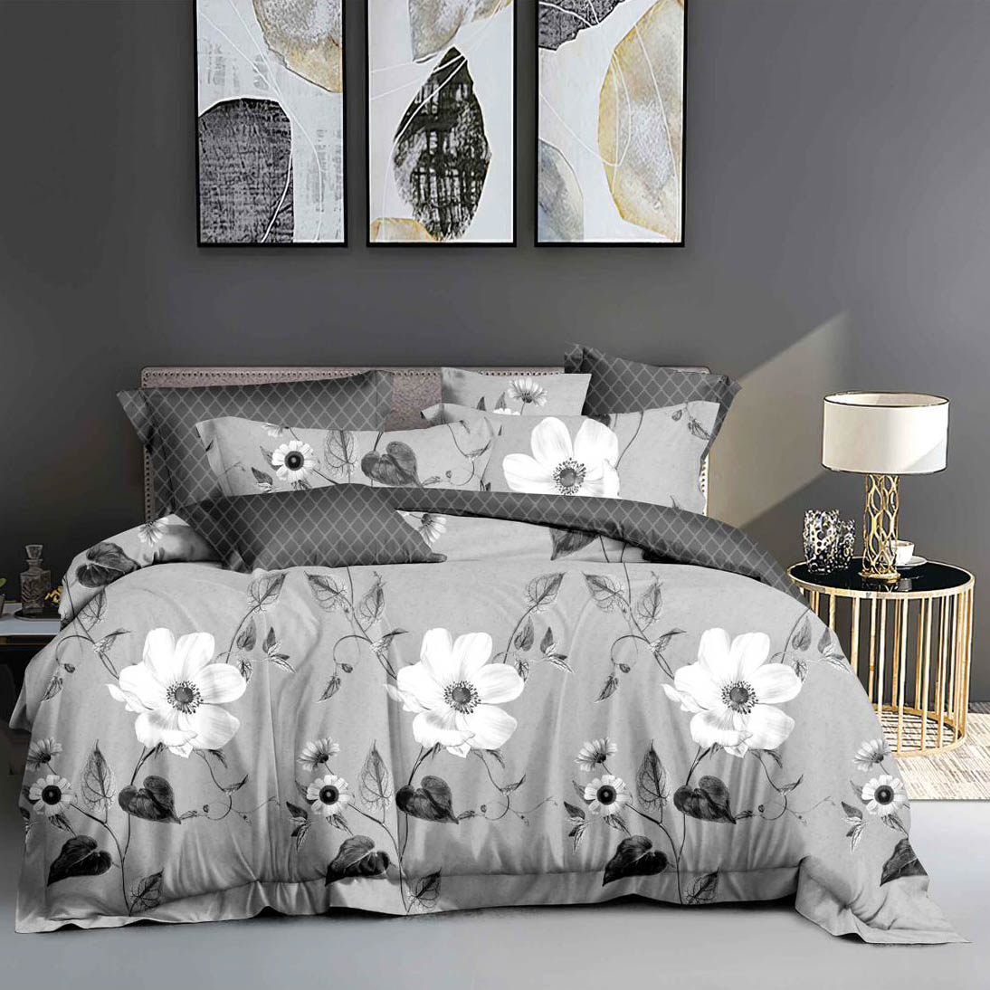 Lenjerie pat dublu, Finet, 6 piese, Gri, flori