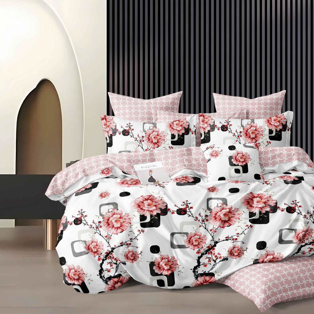 Lenjerie pat dublu, Finet, 6 piese, Alb, Negru, flori