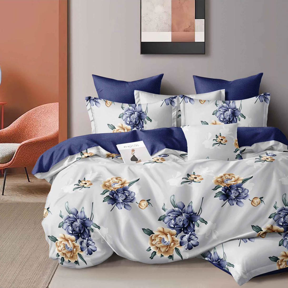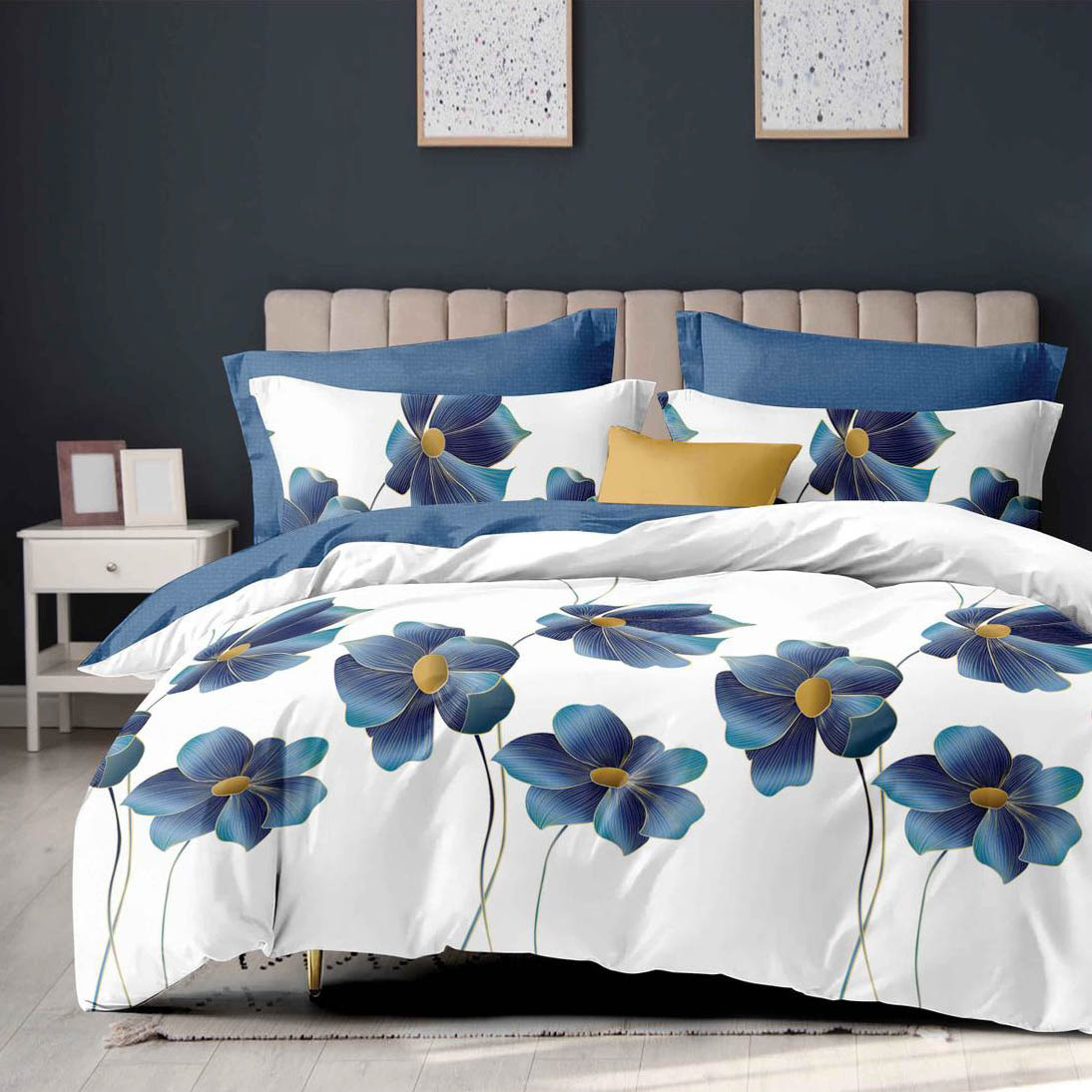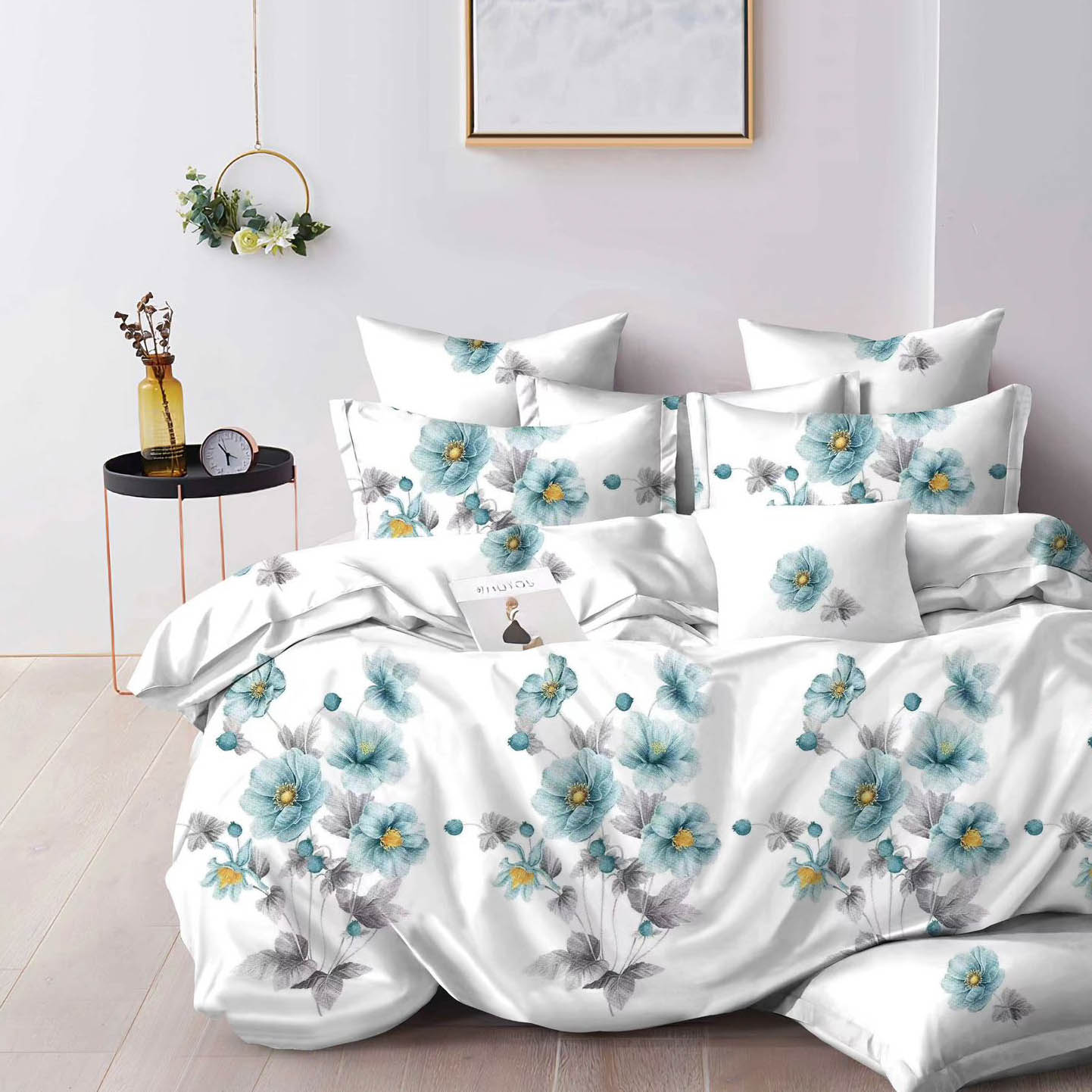 Lenjerie pat dublu, Finet, 6 piese. Bleu, flori