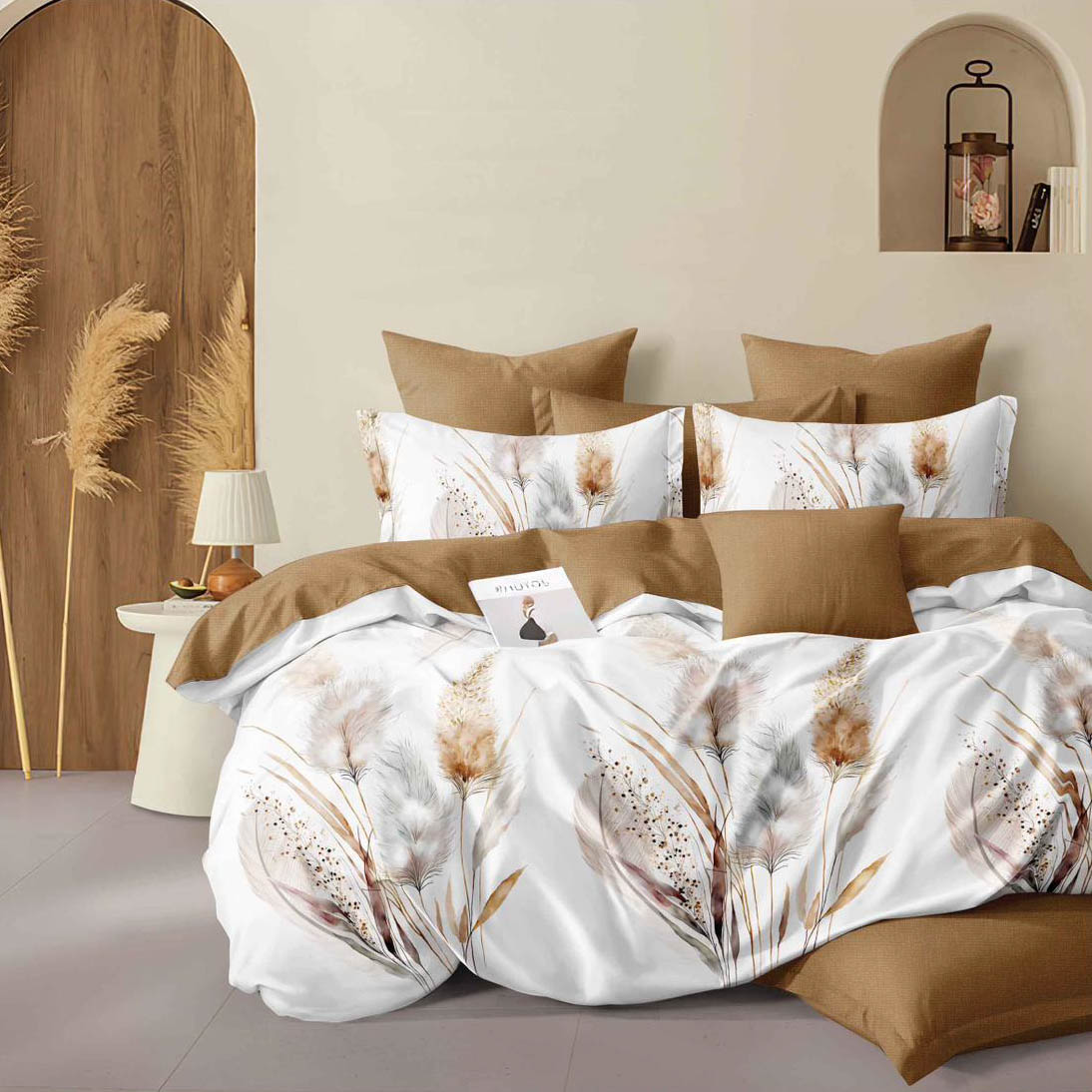 Lenjerie pat dublu, Finet, 6 piese, Crem, Maro, flori
