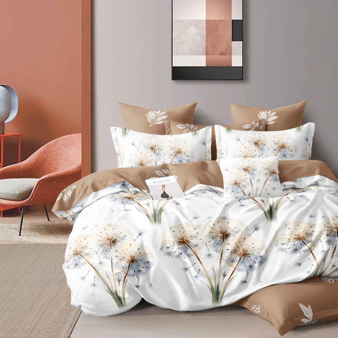 Lenjerie pat dublu, bumbac satinat, 4 piese, Alb, Maro, abstract