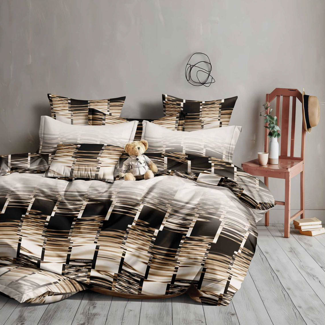 Lenjerie pat dublu, bumbac satinat, 4 piese, Maro, abstract
