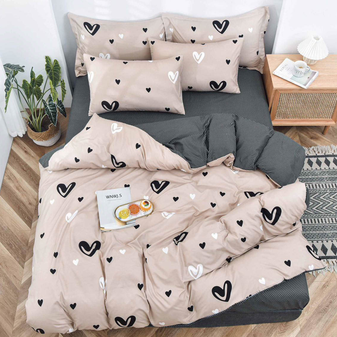 Lenjerie pat dublu, bumbac satinat, 4 piese, Bej, Gri, inimioare