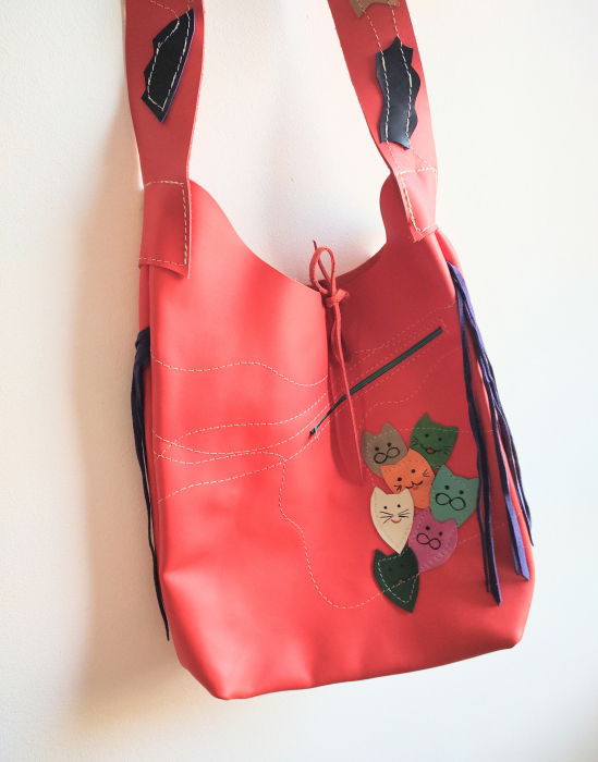 Geanta sac din piele naturala intoarsa rosie ,cu pisicute ,unicat