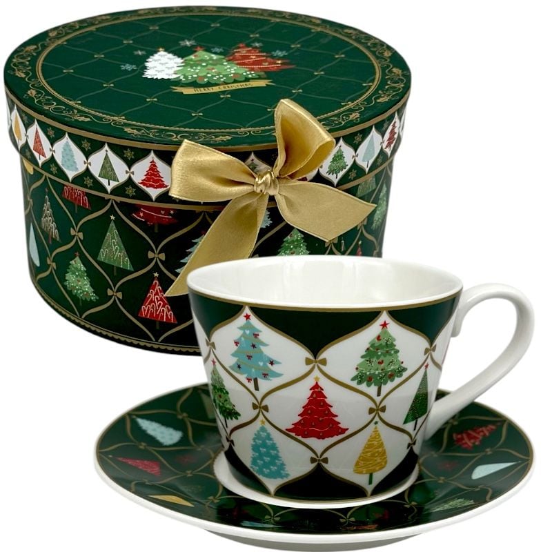 Cadou de Crăciun – Ceașcă ceramică cu farfurioară în cutie festivă verde,d 16cm,h 9cm, en-gros