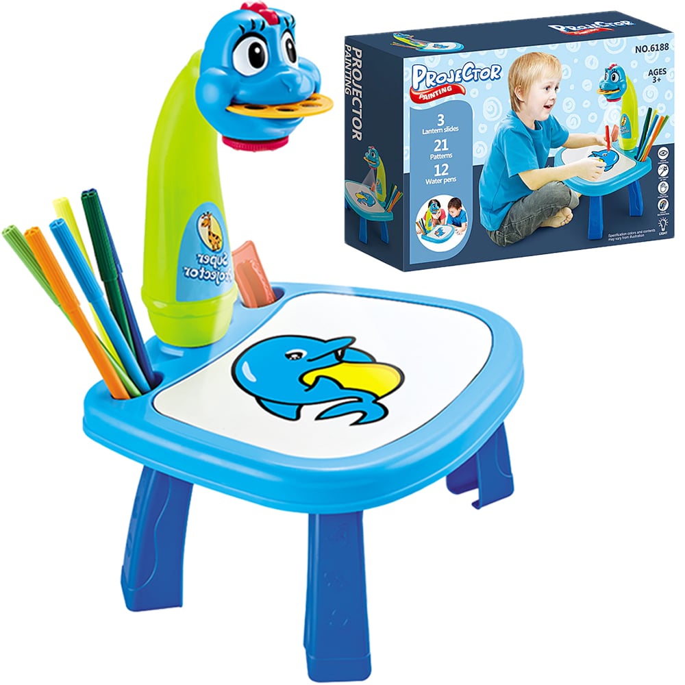 Jucarie educationala tip tabla Engros, masuta de desenat cu proiector, cu hologram, 3 discuri cu 21 sabloane si 12 carioci pentru copiii, model dinozaur albastru Pitikot®