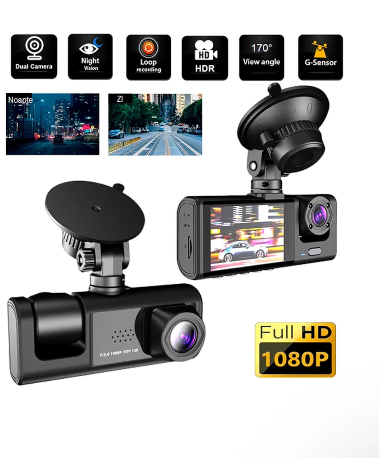 Camera auto tripla FullHD, 3 camere-fata/spate/interior, ecran 2, G Senzor,