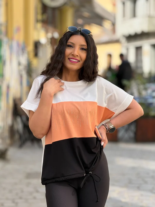 Bluza dama tricolor cu alb, corai si negru si pietricele