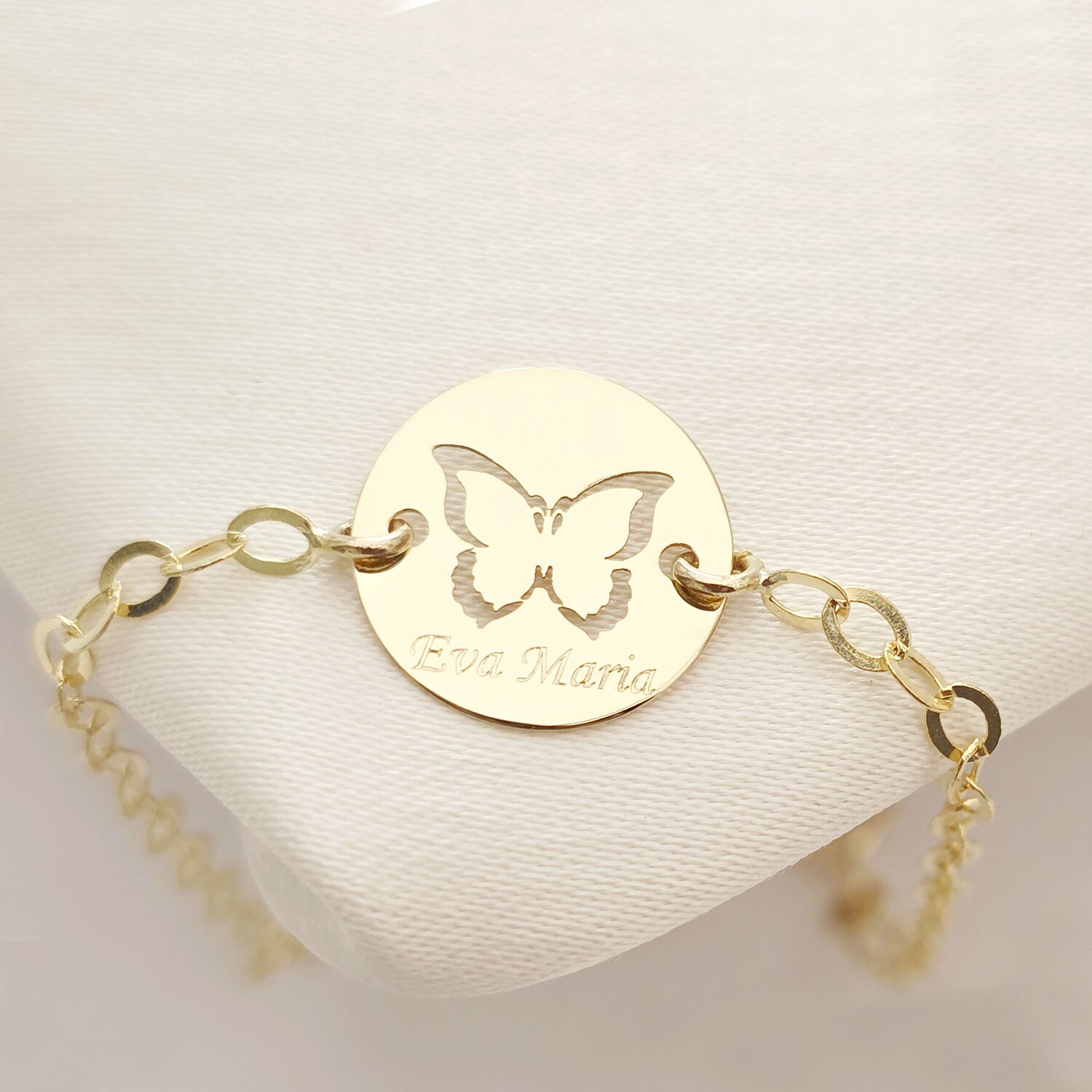 Bratara personalizata cu nume - Fluture decupat - Aur Galben 14K - Banut 12 mm diametru - Cu lantisor fata/baiat