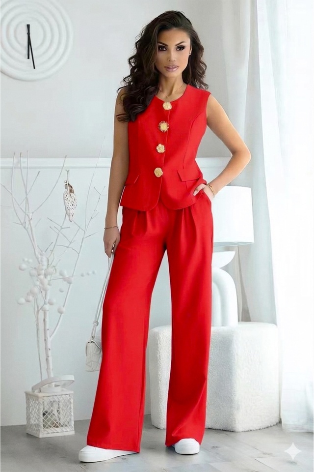 Compleu Valeska, cu pantaloni largi si vesta eleganta accesorizata, Rosu, Marime S/M