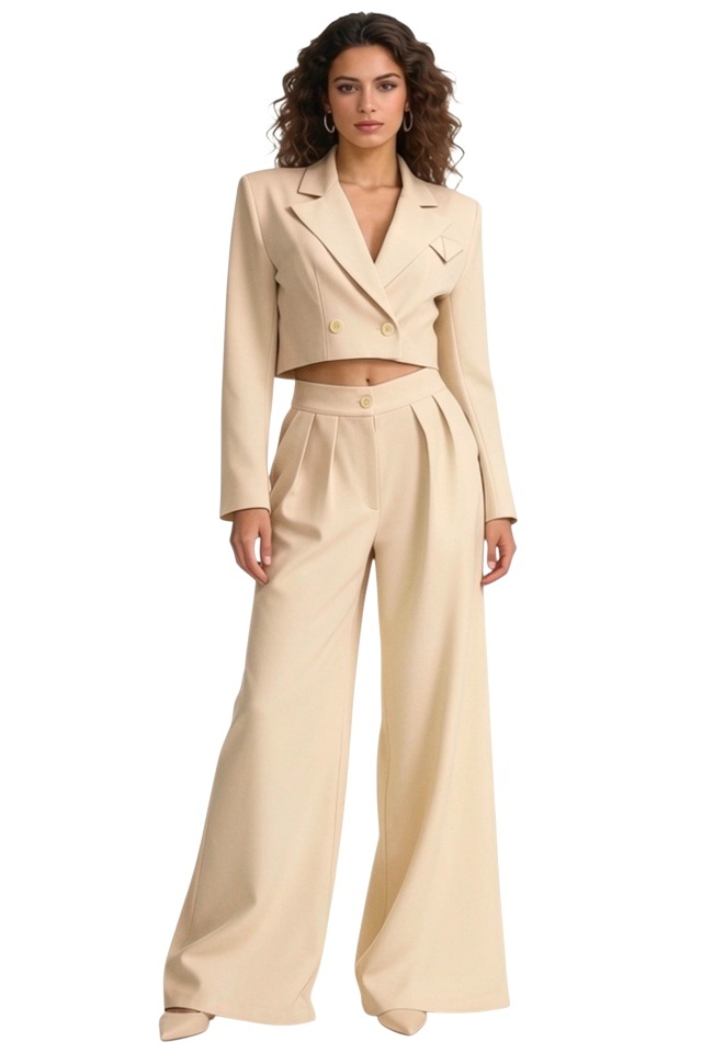 Costum casual de dama Elysian, cu sacou scurt si pantaloni wide leg, Crem, Marime S/M