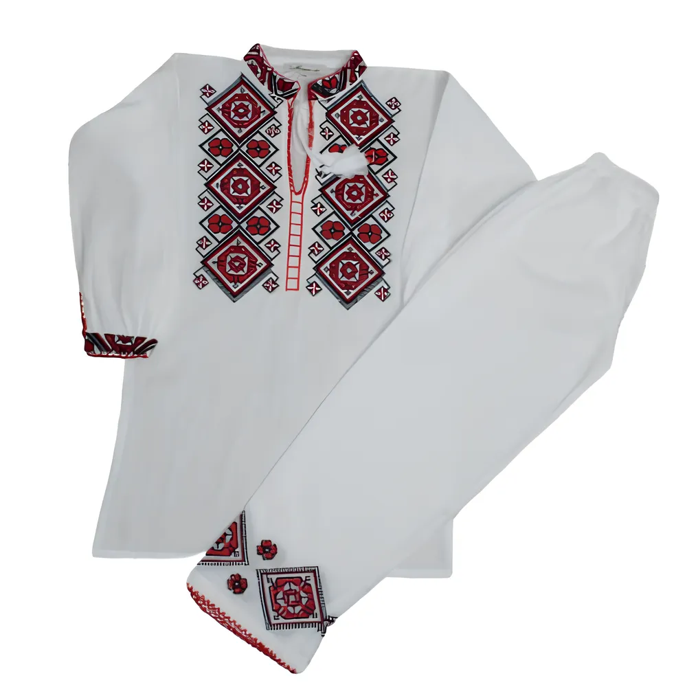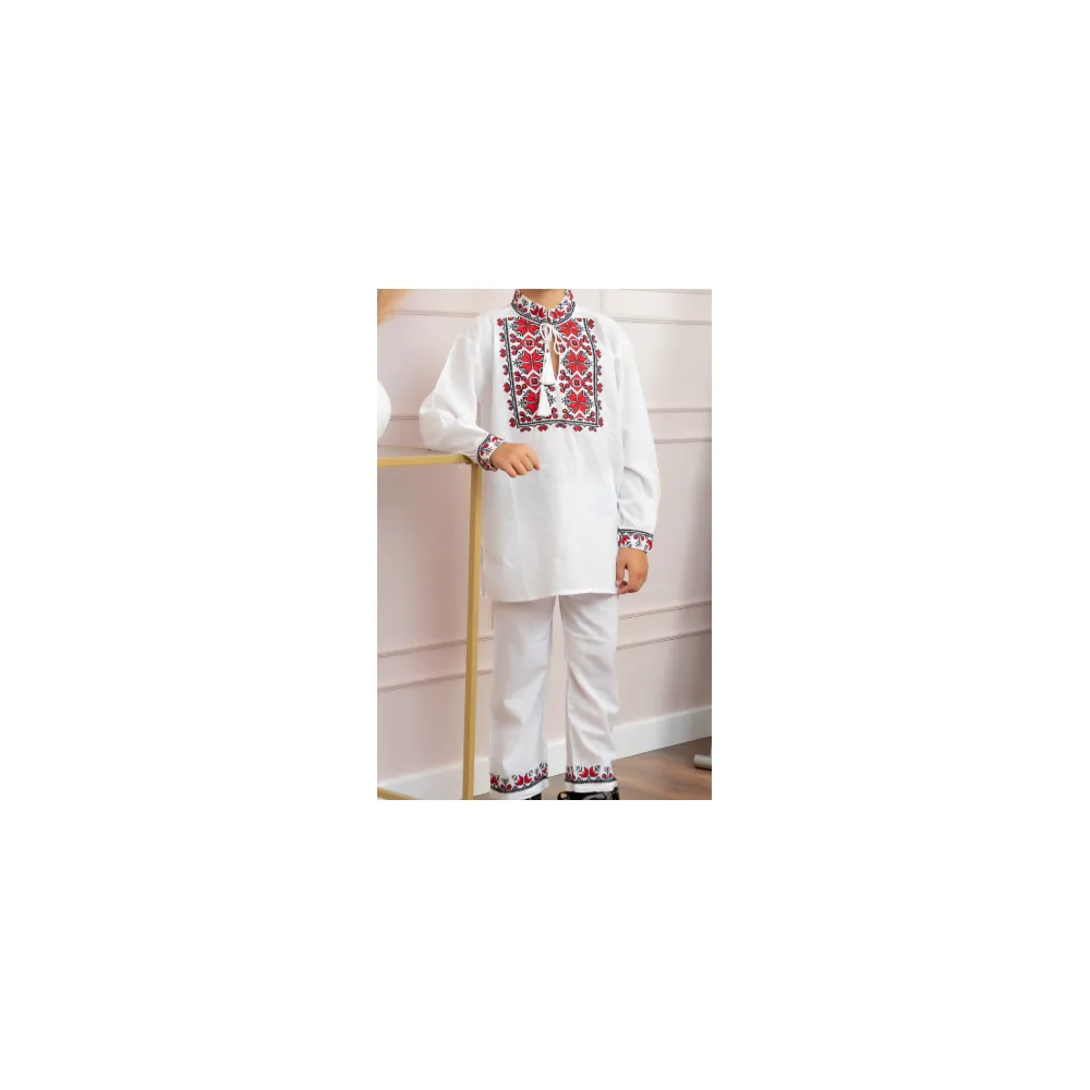 Compleu Traditional Alb pentru Baieti cu Motiv Geometric Rosu - IMS27R