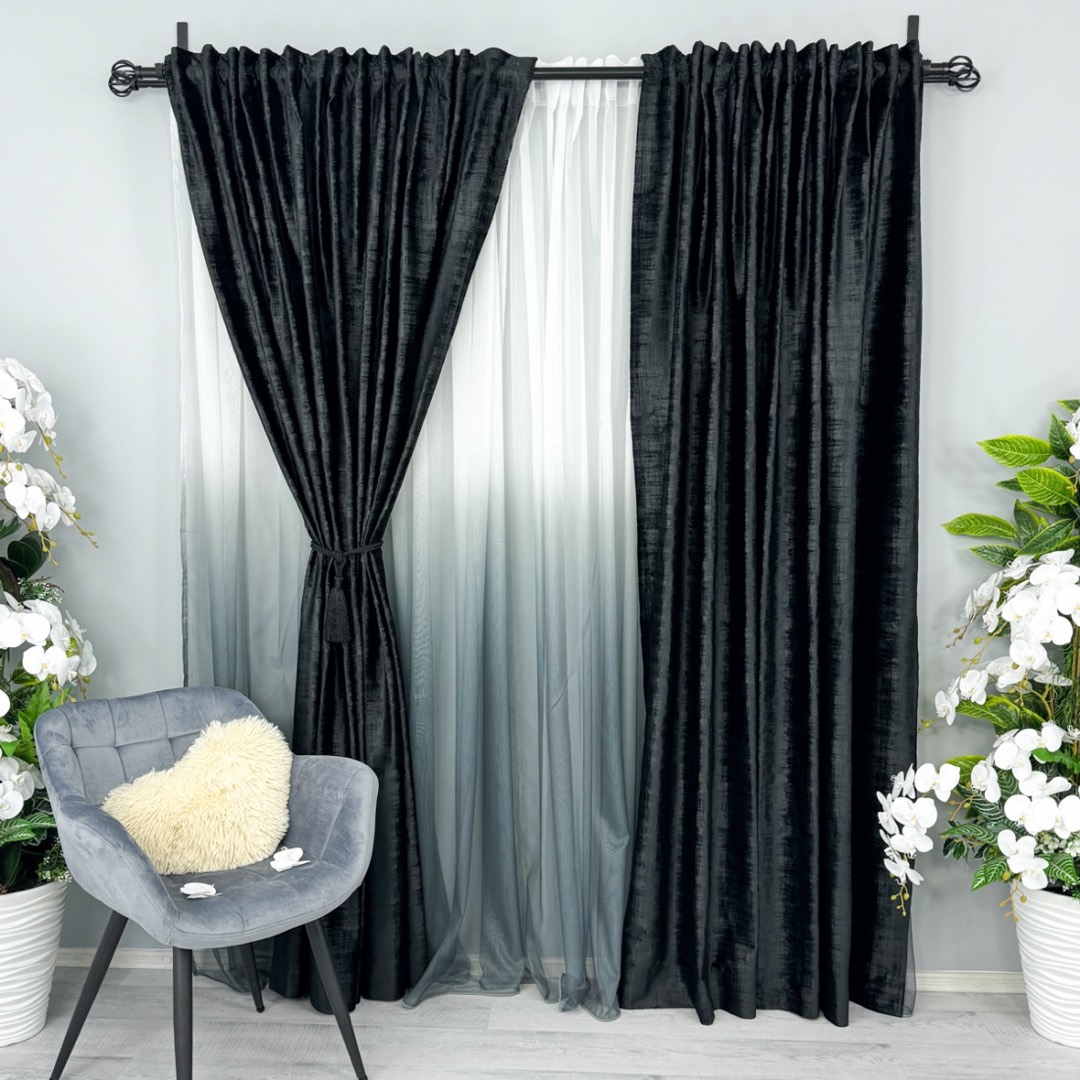 Set 2 Draperii Catifea cu model Venti, Negru, 140cm latime x 260cm inaltime, cu tiv lat pt bara
