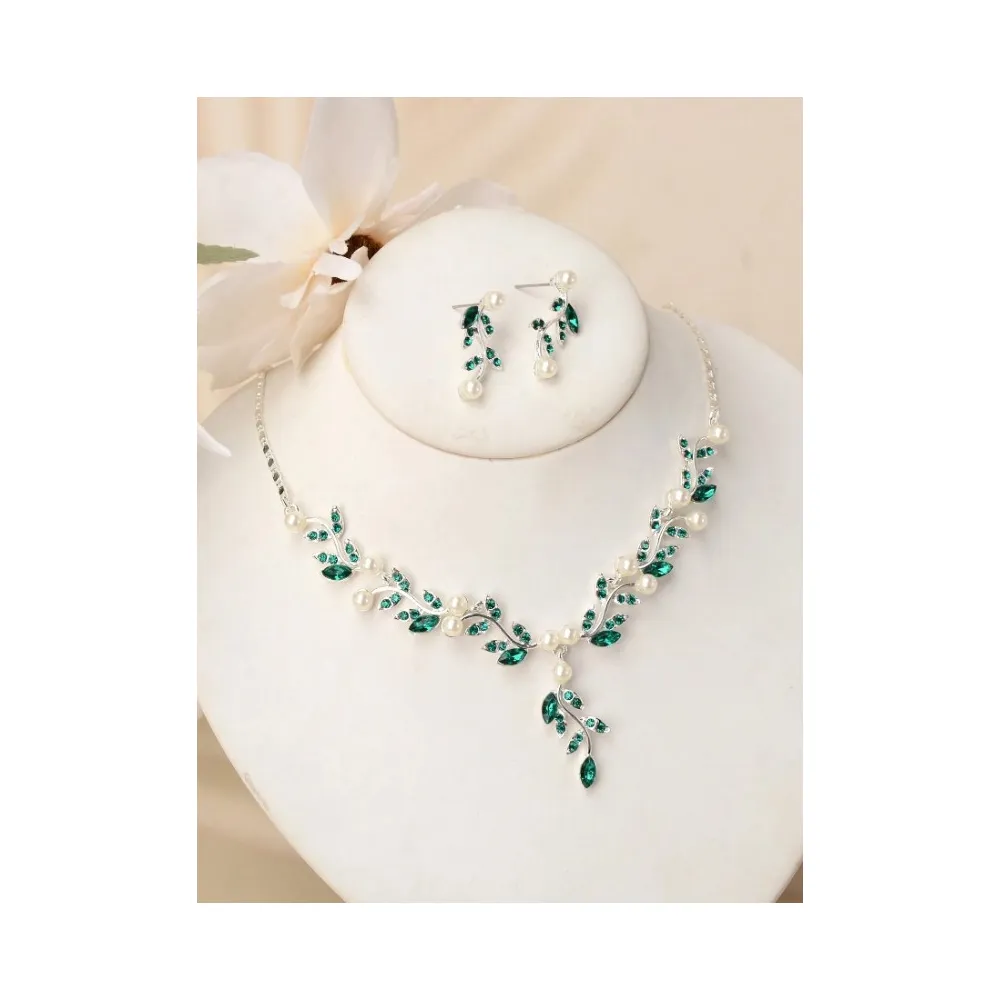 Set Bijuterii Cu Strasuri 3 Piese, Colier si Cercei Argintiu cu Verde - 69279