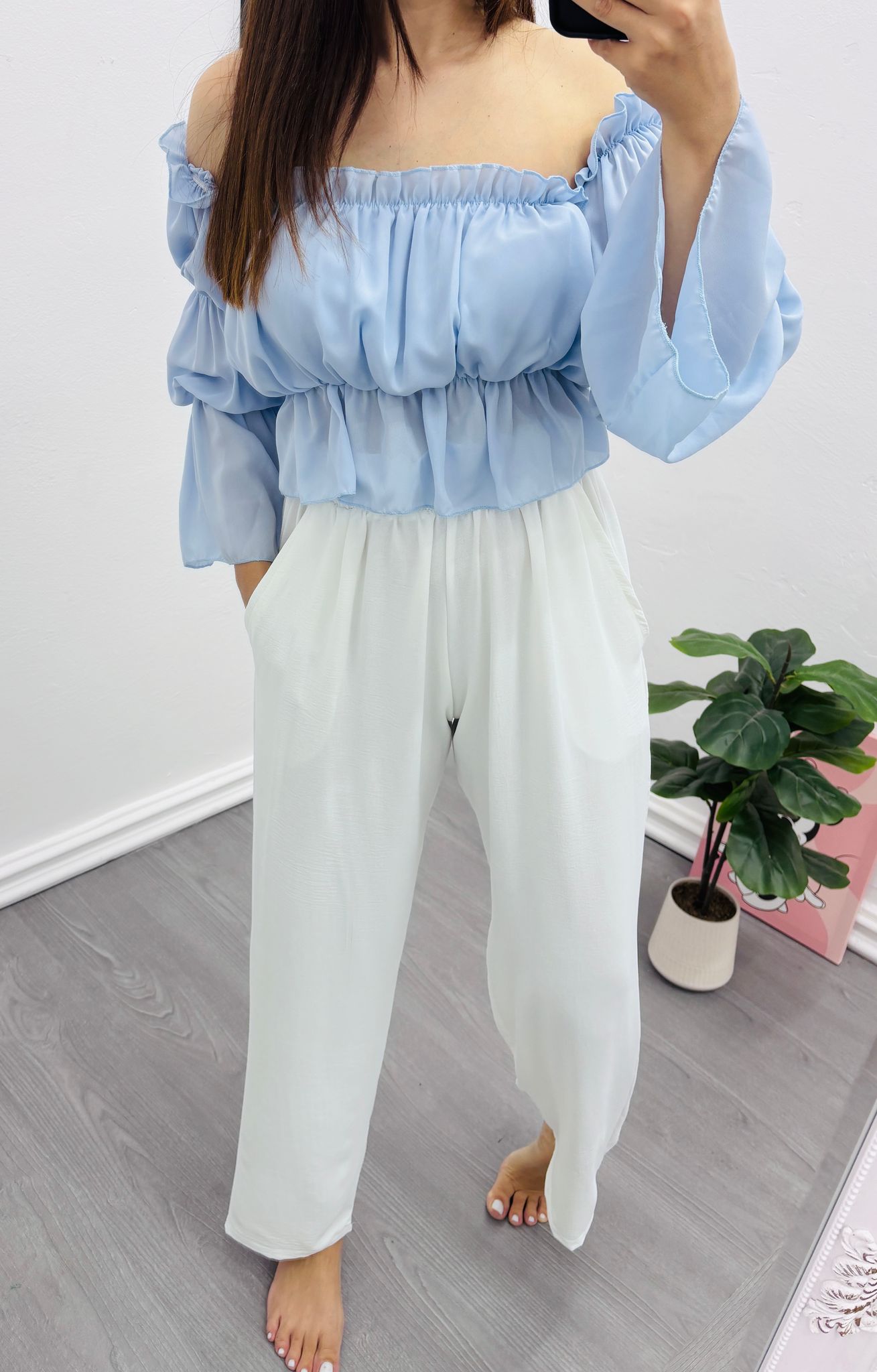 Compleu pentru femei, 2 piese, vaporos, Alb/Albastru