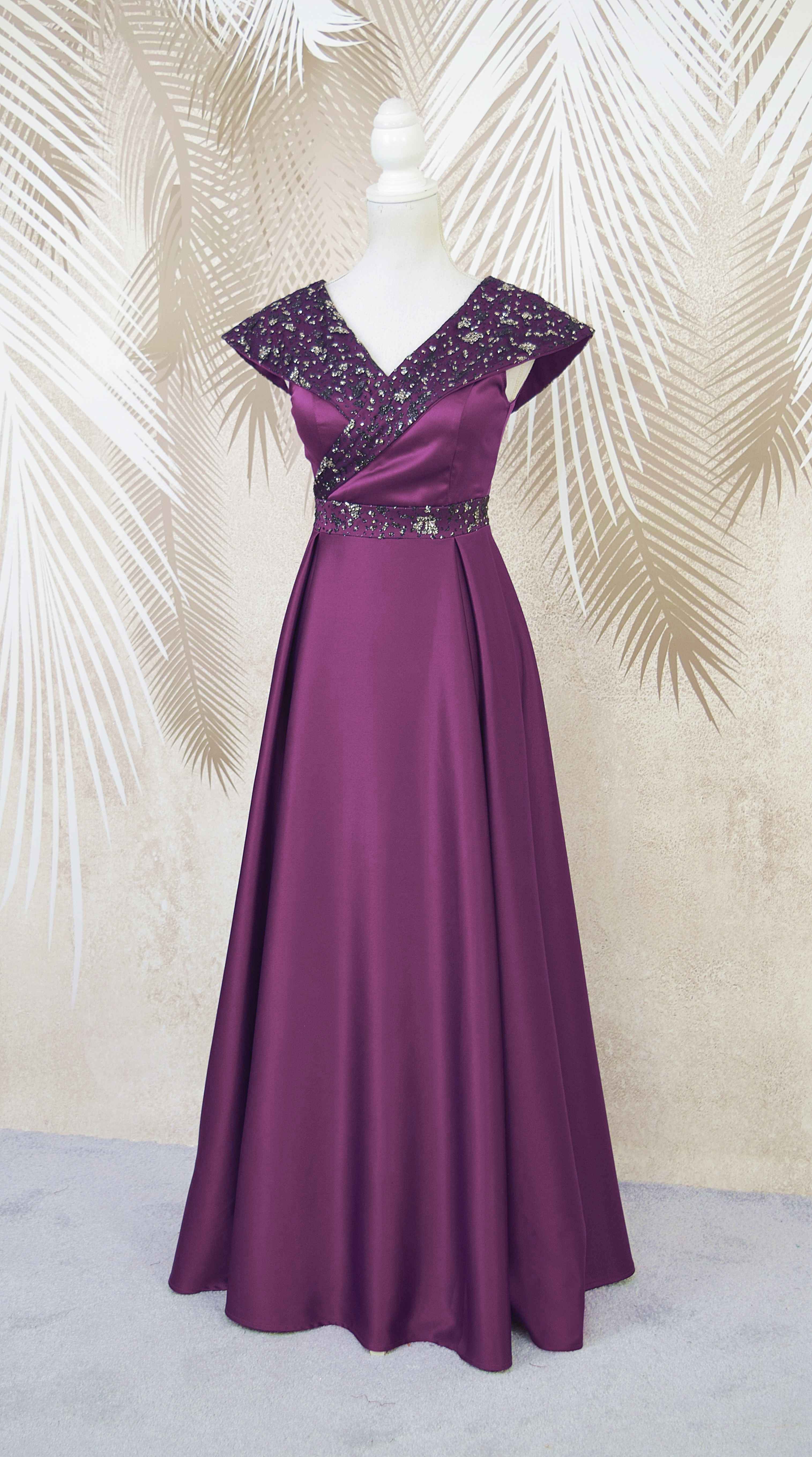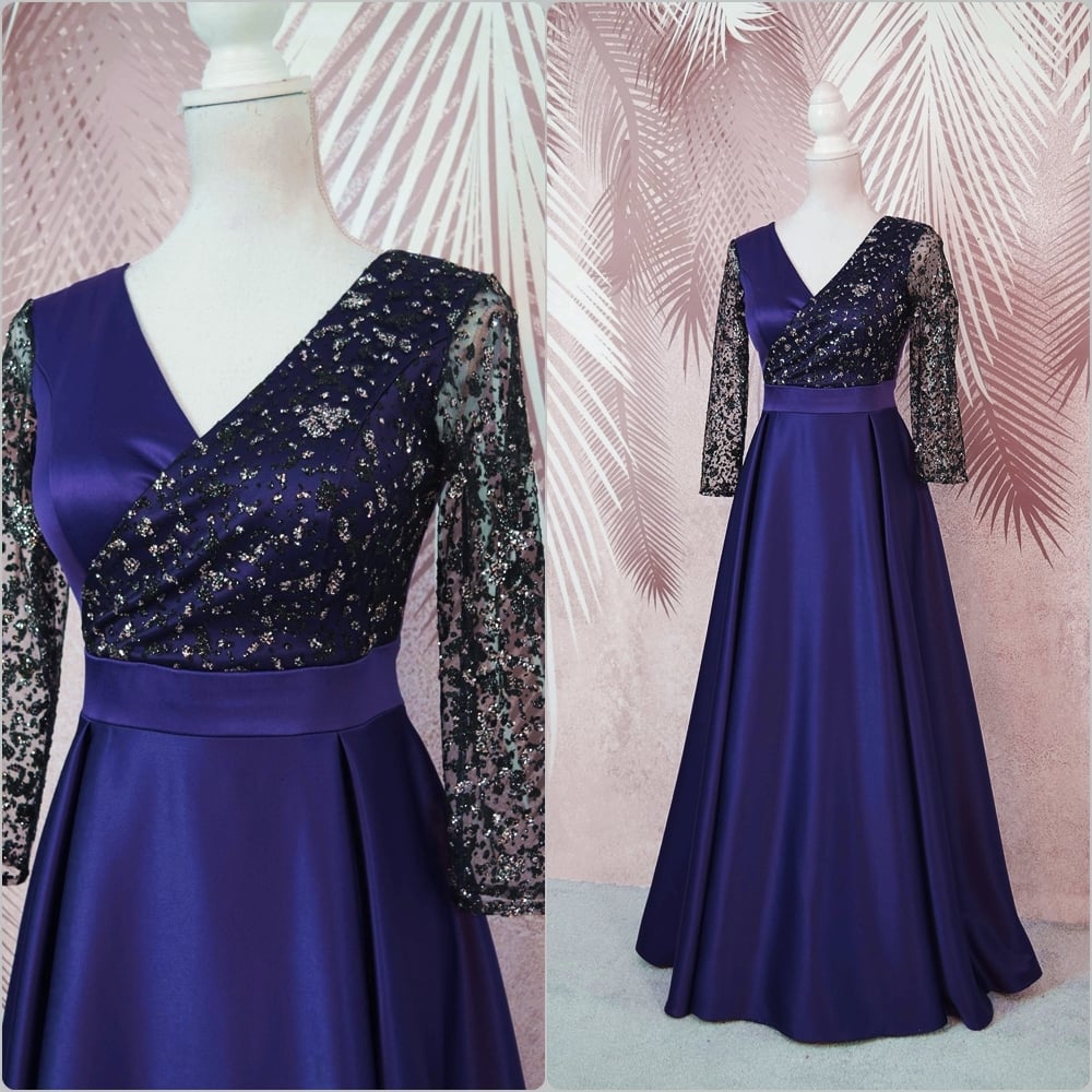 Rochie lunga de ocazie din tafta elastica mov si tull cu gliter gri.