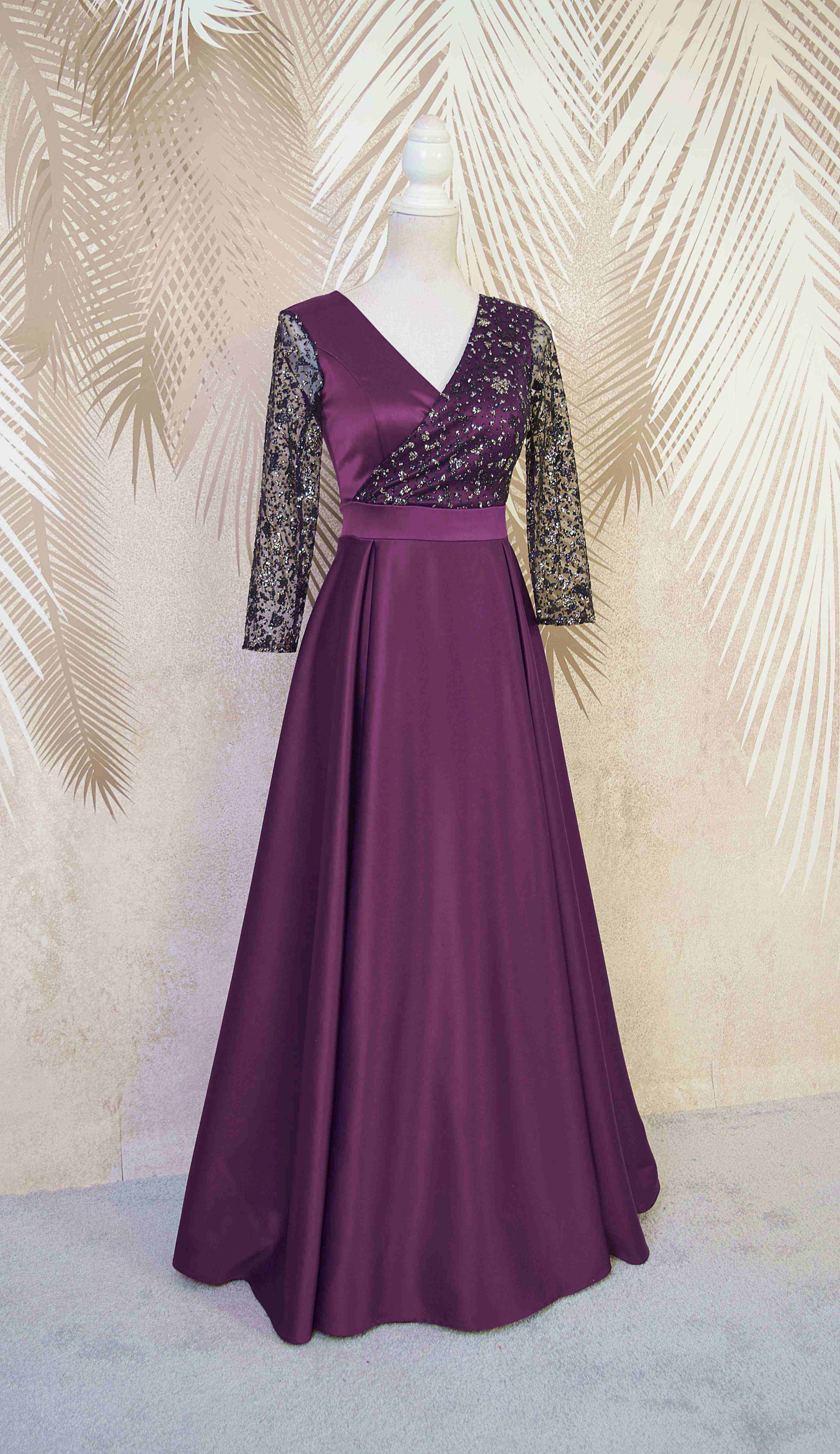 Rochie lunga de ocazie din tafta elastica mov si tull cu gliter gri M2