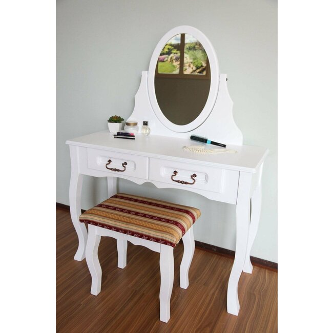Set măsuță de toaletă + oglindă + taburet Milly, structură lemn masiv + PAL, design elegant, 160x55x80 cm, alb patinat