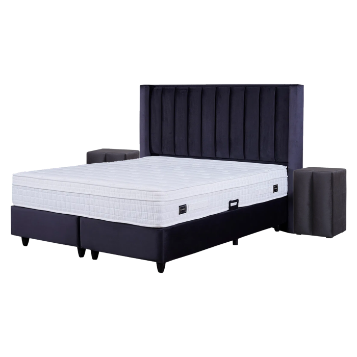 Set Pat tapitat BLACK, 160x200 cm, lada depozitare, negru + Saltea CROWN, cu arcuri, 160x200 cm, H 27 cm + 2 Noptiere BLACKBERRY cu 1 usa