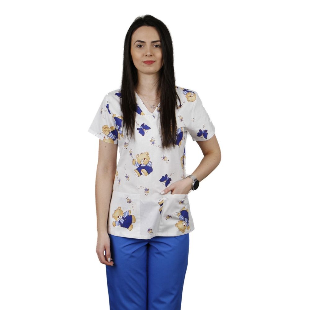 Bluza dama CLARA Imprimeu, urs alb/albastru - Uniforma Medicala