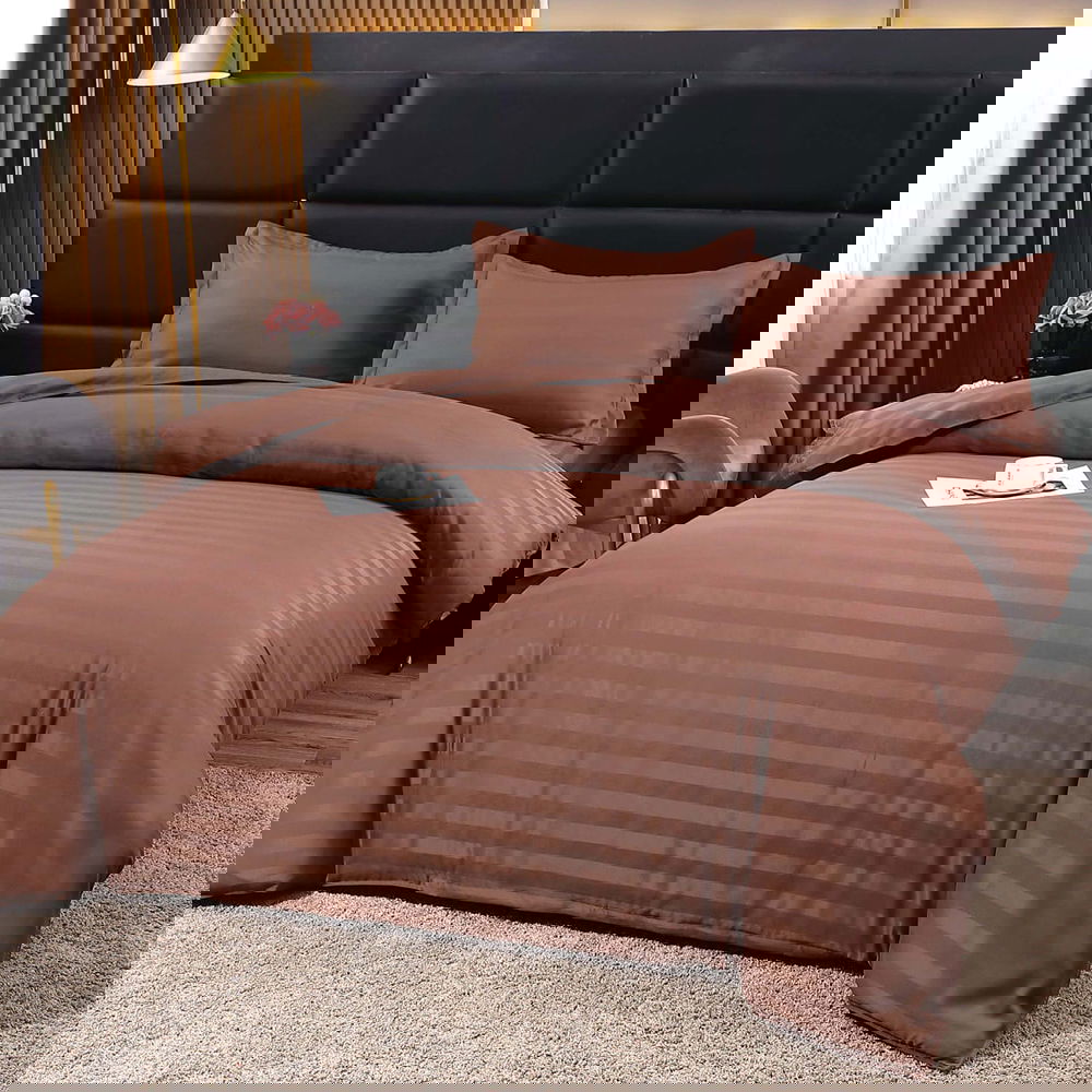 Lenjerie de Pat Damasc Premium 4 Piese cu Cearceaf Elastic - Maro Inchis - LDEB_I060