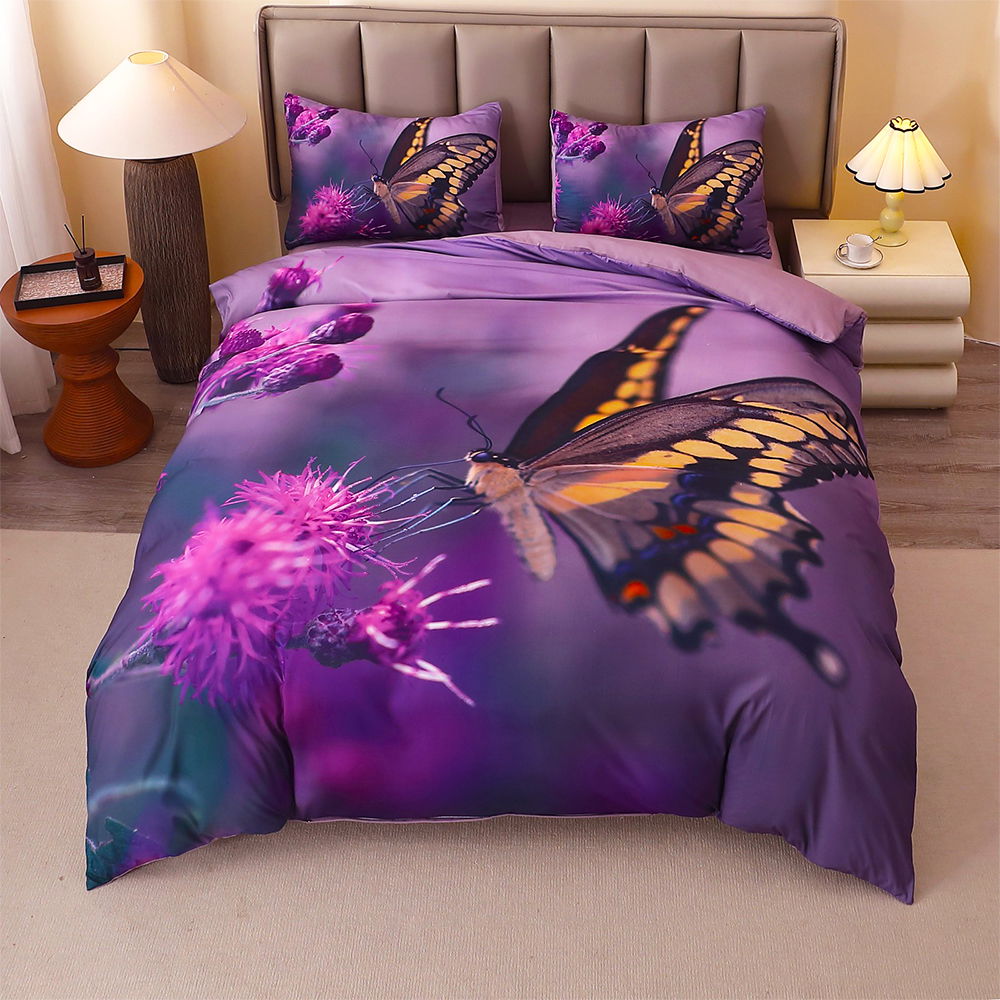 Lenjerie Fluturi si Flori Mov din Finet 5D cu Cearceaf Elastic 160/180x200cm, 4 Piese - LFDEB_A106C