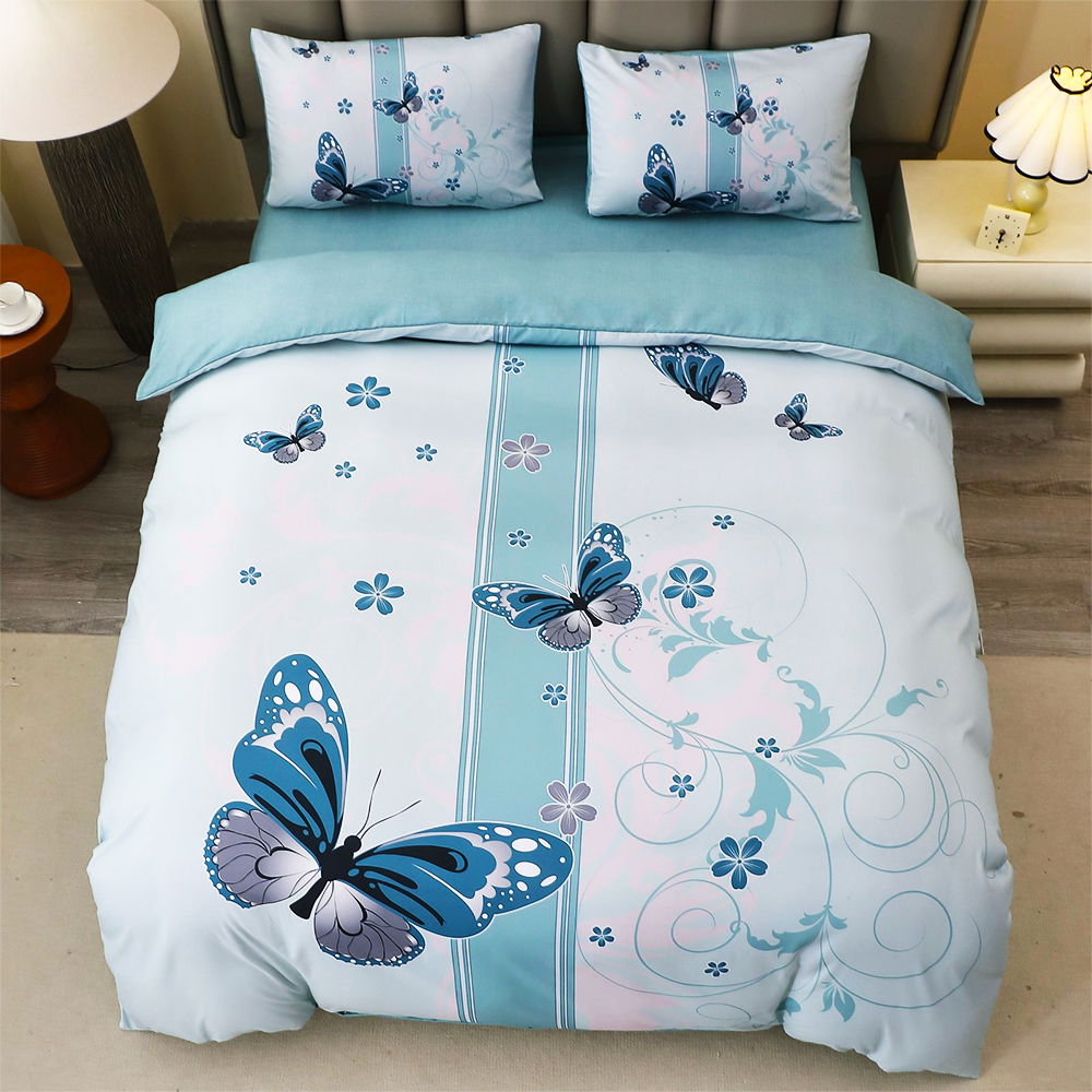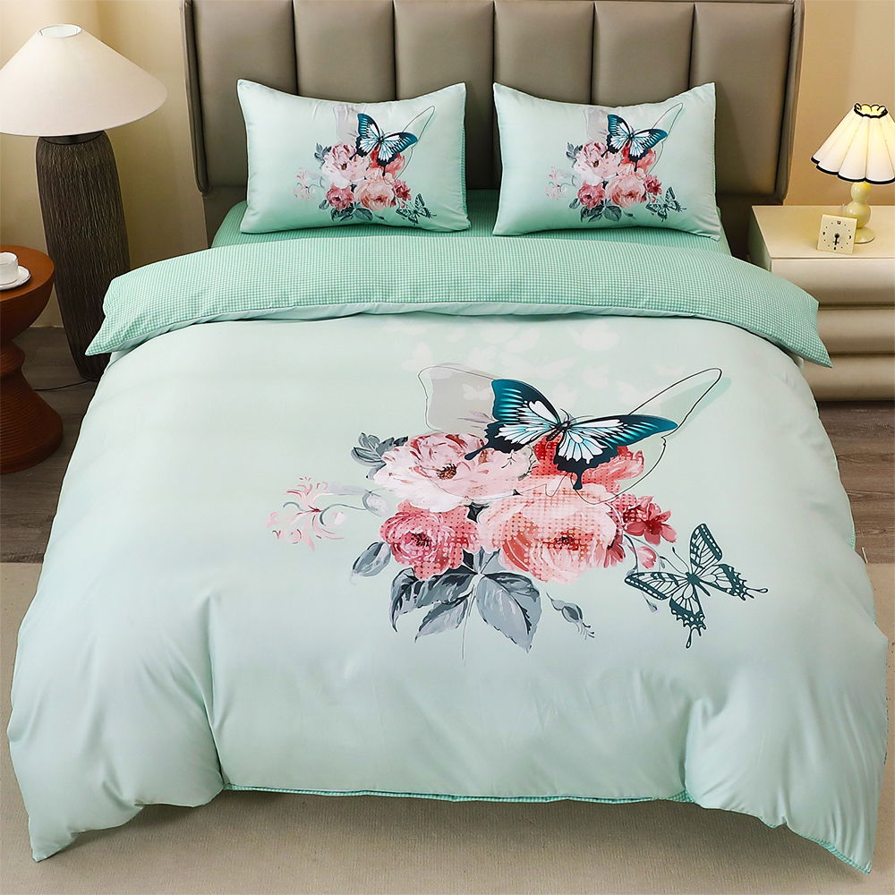 Set CADOU - Lenjerie din Finet 5D cu Elastic - 4 Piese + Pilota Groasa + 2 Perne 50x70 cm - Fluturi si Flori Desenate - LFDEB_A112C