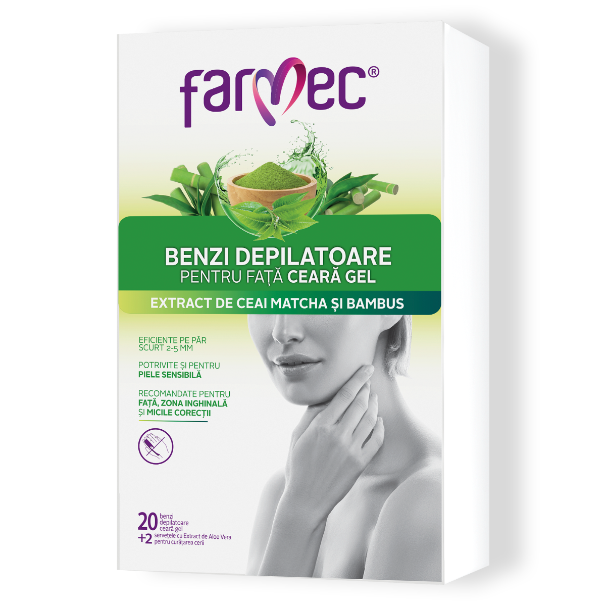 Benzi Depilatoare Pentru Față Cu Ceară Gel, Extract De Bambus și Matcha, Farmec, 20 Buc