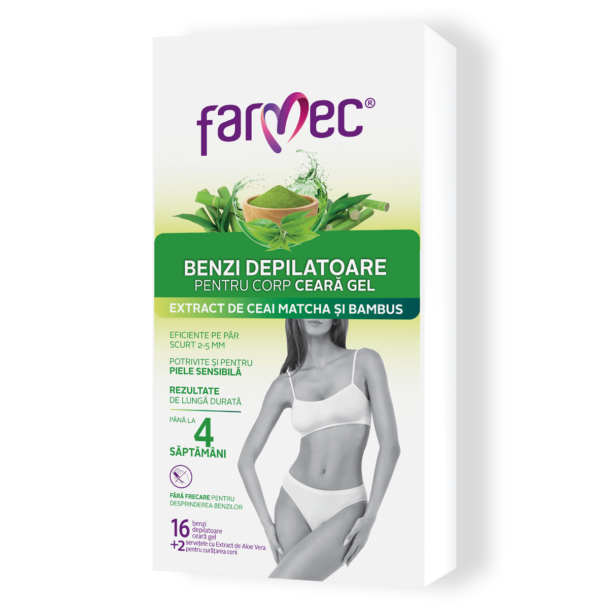Benzi Depilatoare Pentru Corp Cu Ceară Gel, Extract De Bambus și Matcha, Farmec, 16 Buc