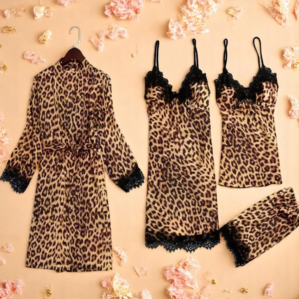 Set Pijama de Dama 4 Piese din Satin, Culoare Animal Print - ANI110