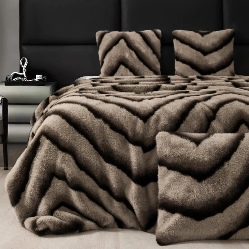 Set de Lux Din Blana Artificiala de Nurca, Cu Fermoar, Hipoalergenic, Patura + 2 Fete de Perna, Maro/Negru - JOJ699