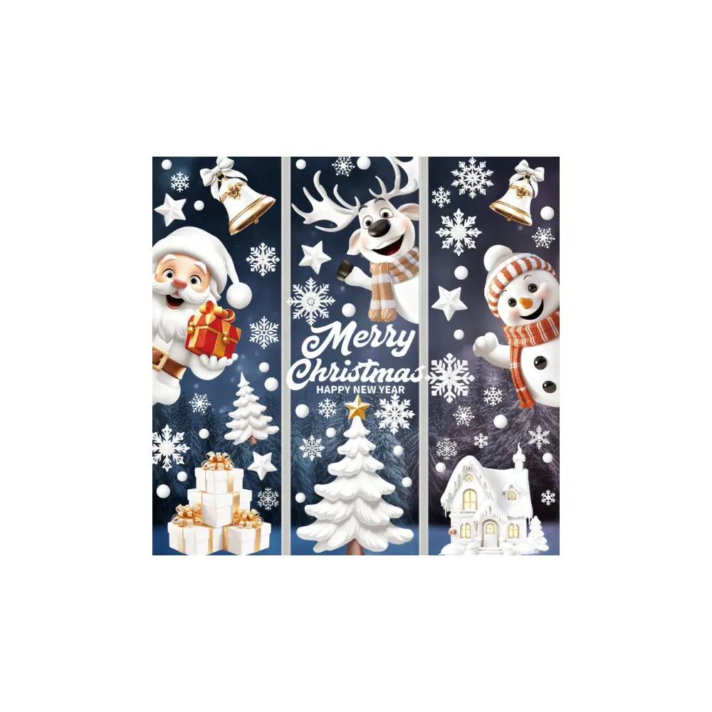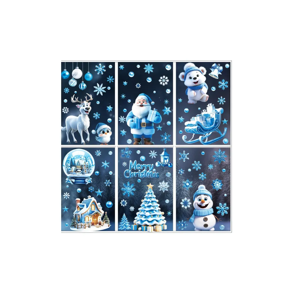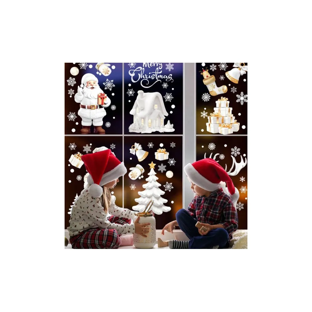 Sticker Perete Autocolant Mos Craciun, Sanie, Ren si Om de Zapada, 9 buc, 30x20cm, model Geam - 39351
